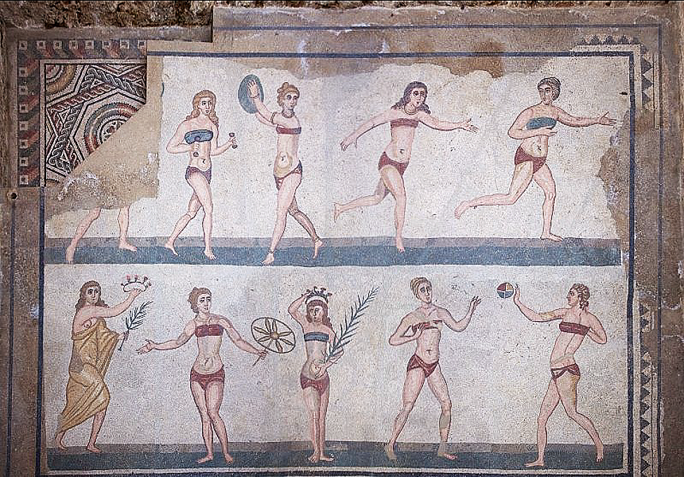 4th century Roman mosaic at Villa Romana del Casale, Sicily (nicknamed “The Bikini Girls Mosaic”)